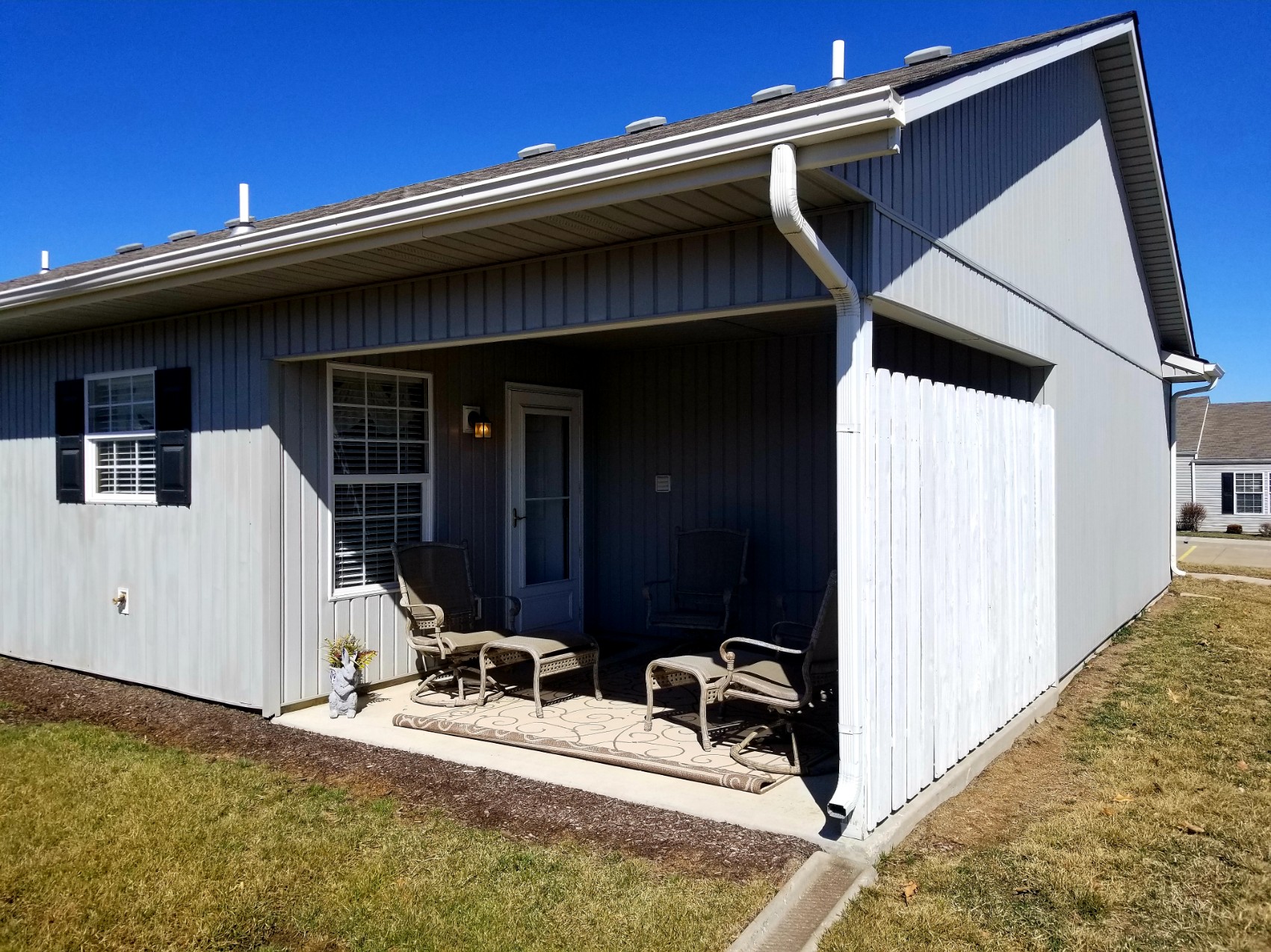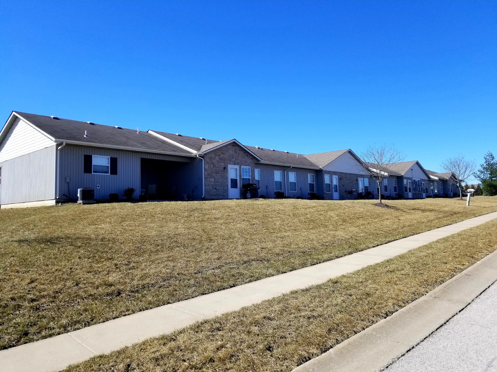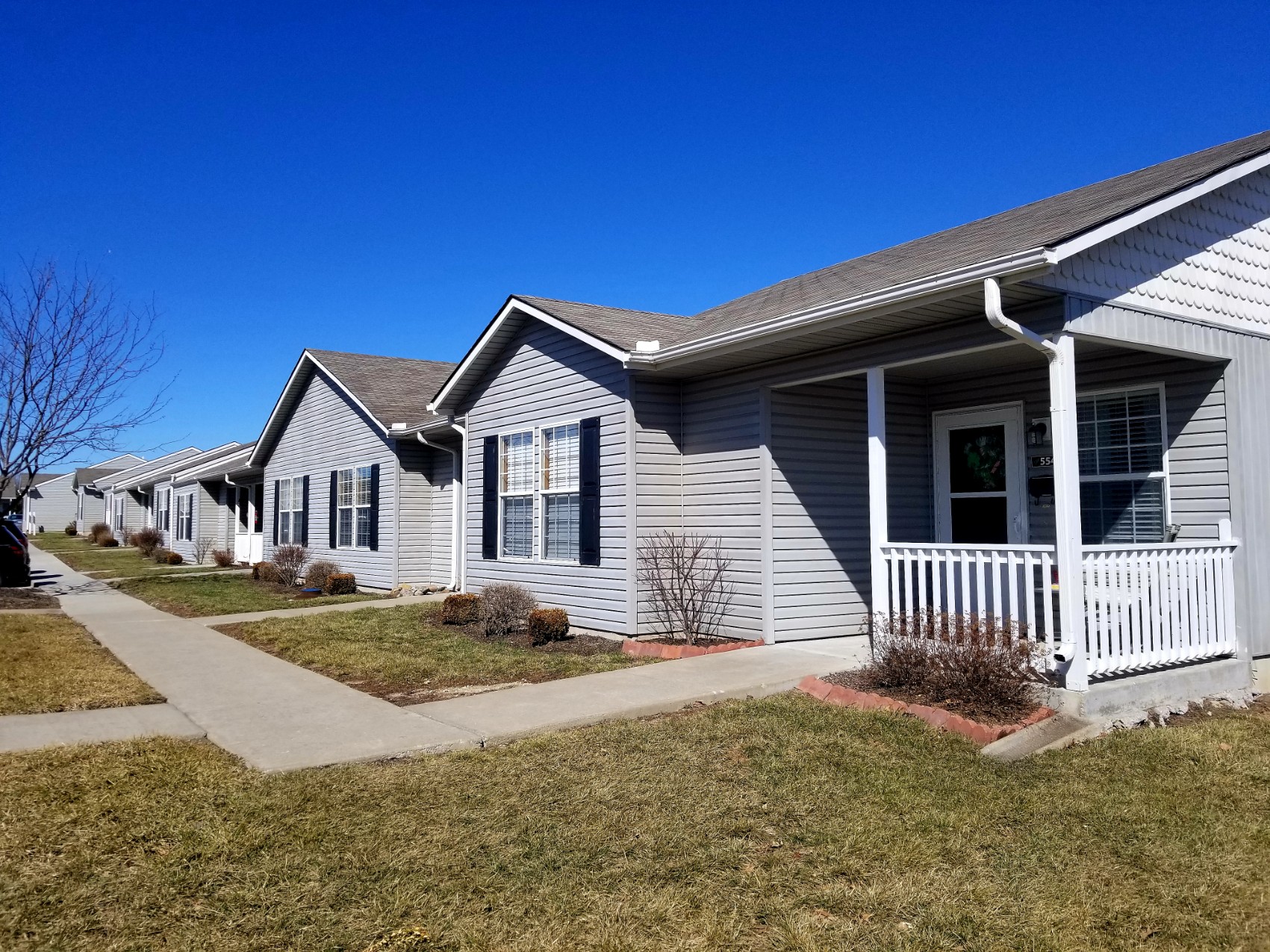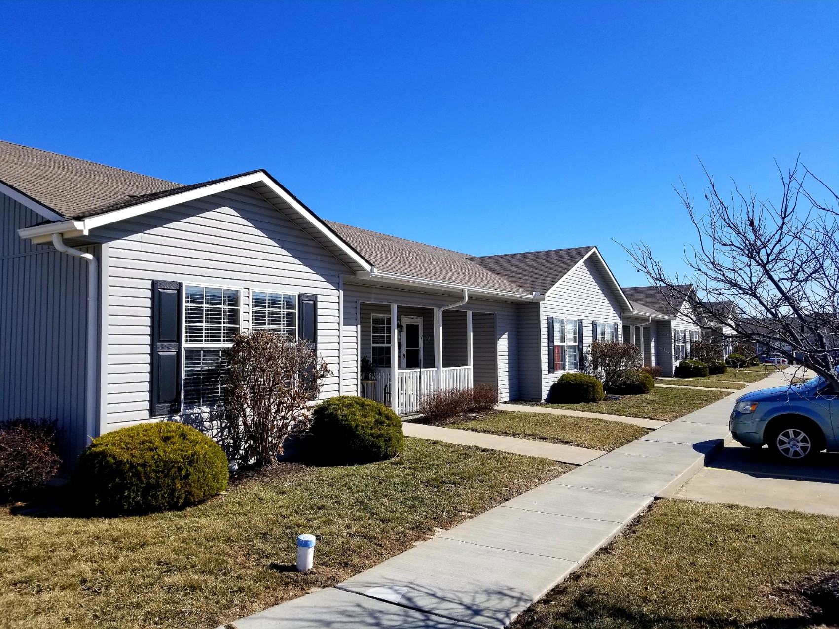 The one-bedroom / one-bath units are 740 square feet, and the two-bedroom / one-bath units are 900 square feet. Amenities include all one level units, spacious front porch with railing and back patios, handicap accessible, vinyl flooring, wide doors throughout, oversize closets, well-equipped kitchens, built-in microwaves*, washer and dryer connections, mail delivered to front door, curbside valet trash pick up, easy access to walk-in shower, residents park in front of there villa. Community amenities include on-site manager, a beautiful clubhouse, game room, gazebo with decorative waterfall pond and outdoor kitchen, and organized resident activities, lawn care and snow removal,